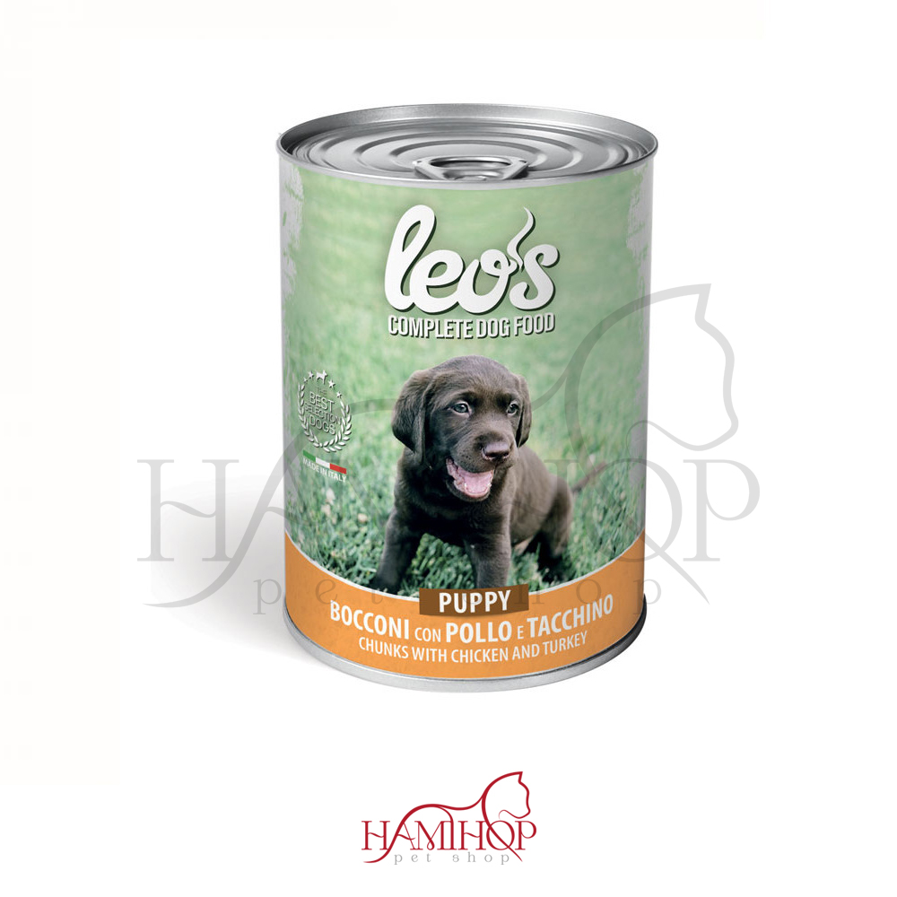کنسرو توله سگ لئوز طعم مرغ و بوقلمون 415گرم LEO’S POLLO E TACCHINO PUPPY LATTINE BOCCONI PER CUCCIOLI 415GR